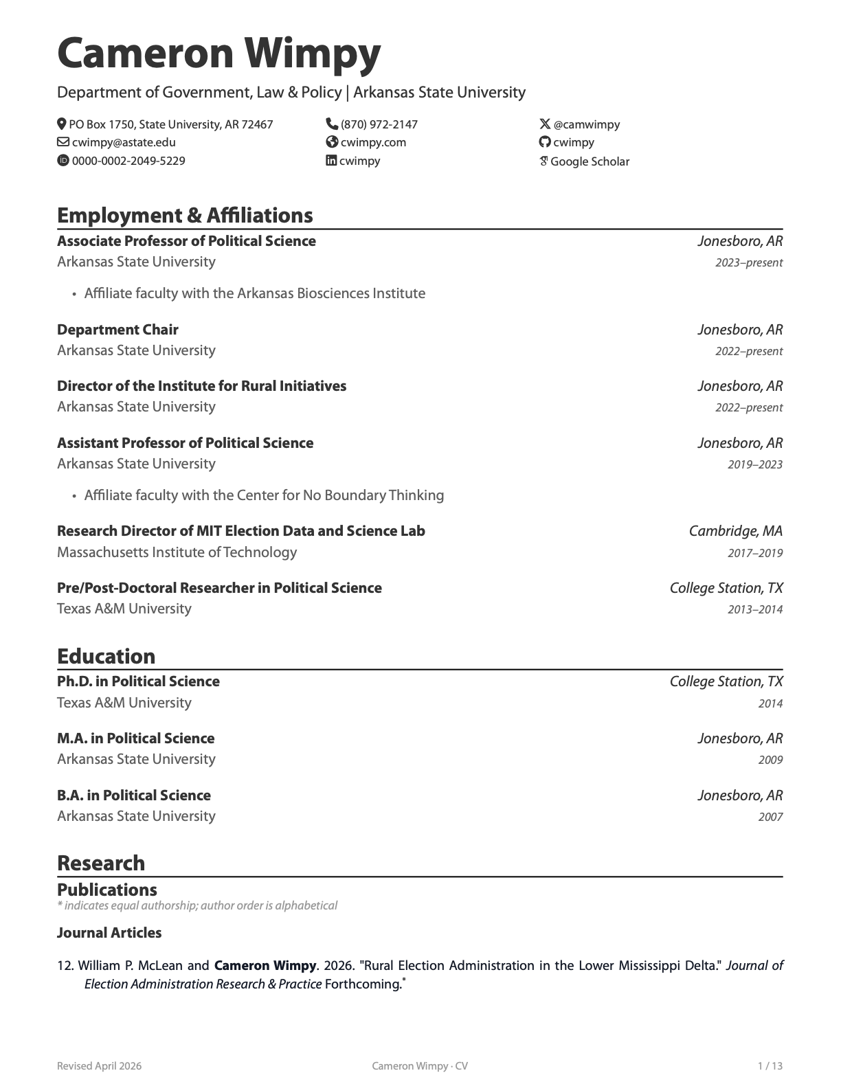 I am associate professor of political science and chair of Government, Law & Policy at Arkansas State University with interests in comparative public administration, election administration, political economy, political methodology, and rural public policy. Since 2022, I have also served as the founding director of the Institute for Rural Initiatives. I am an affiliate faculty with the Arkansas Biosciences Institute at A-State.